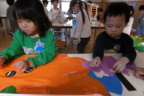 自分たちで、こうもりの目を付けたり、お口を描いたり。かぼちゃの