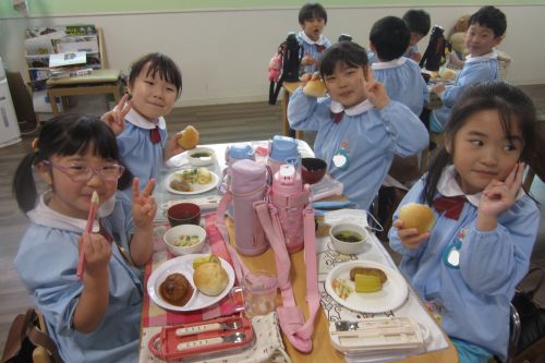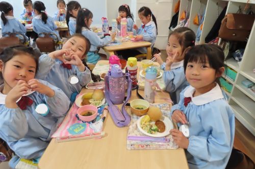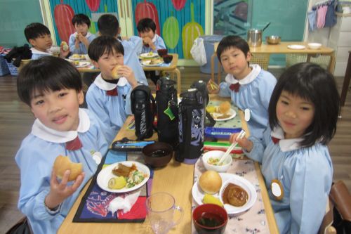 違うクラスのお友だちと4人組を作り、みんなで厨房の先生方が作って下さったお昼をいただきました!